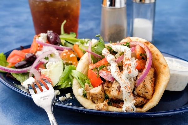 Prepared with Cajun-style chicken, tzatziki sauce, fresh vegetables, and feta cheese. Served on pita bread.