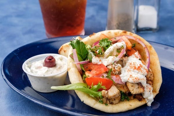 Prepared with rosemary garlic chicken, tzatziki sauce, fresh vegetables, and feta cheese. Served on pita bread.